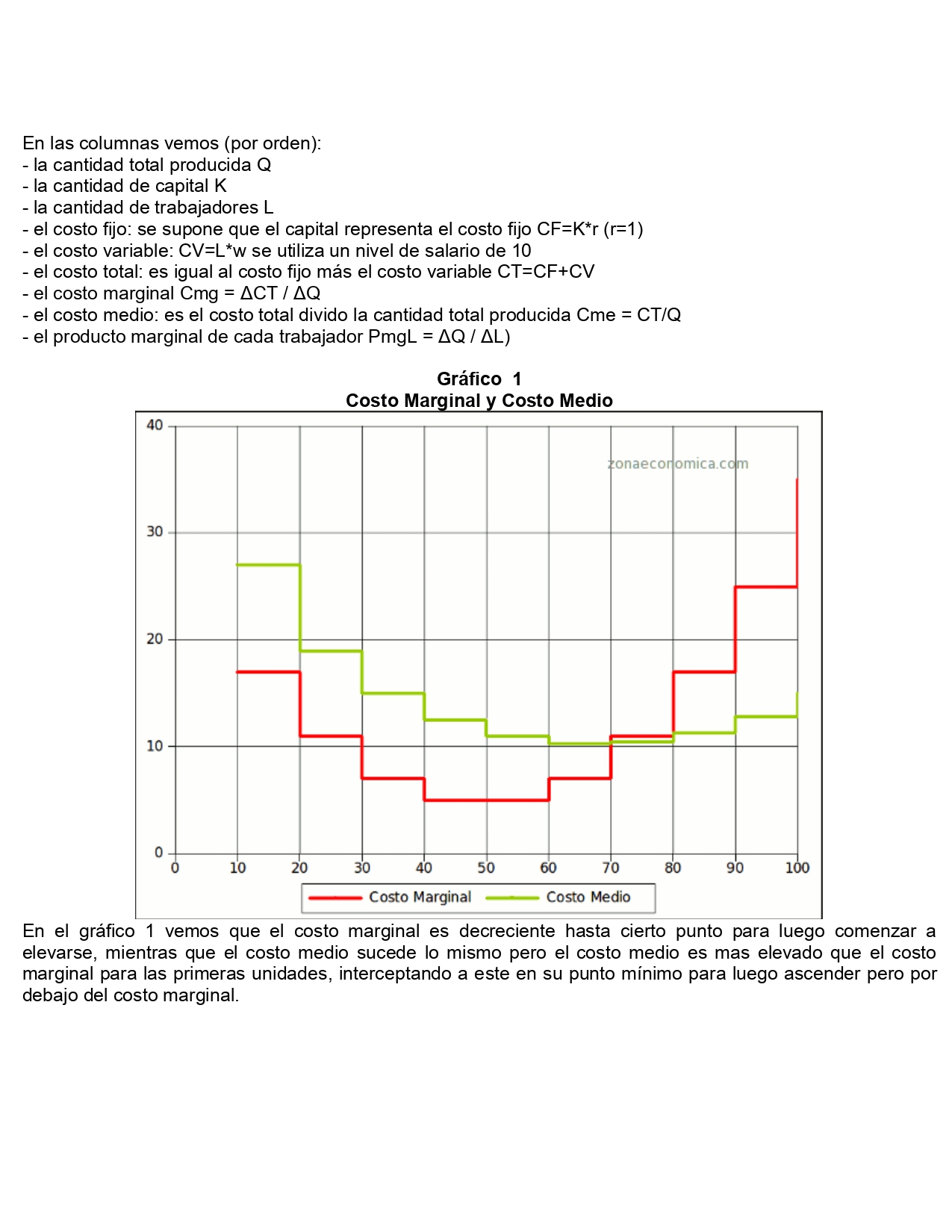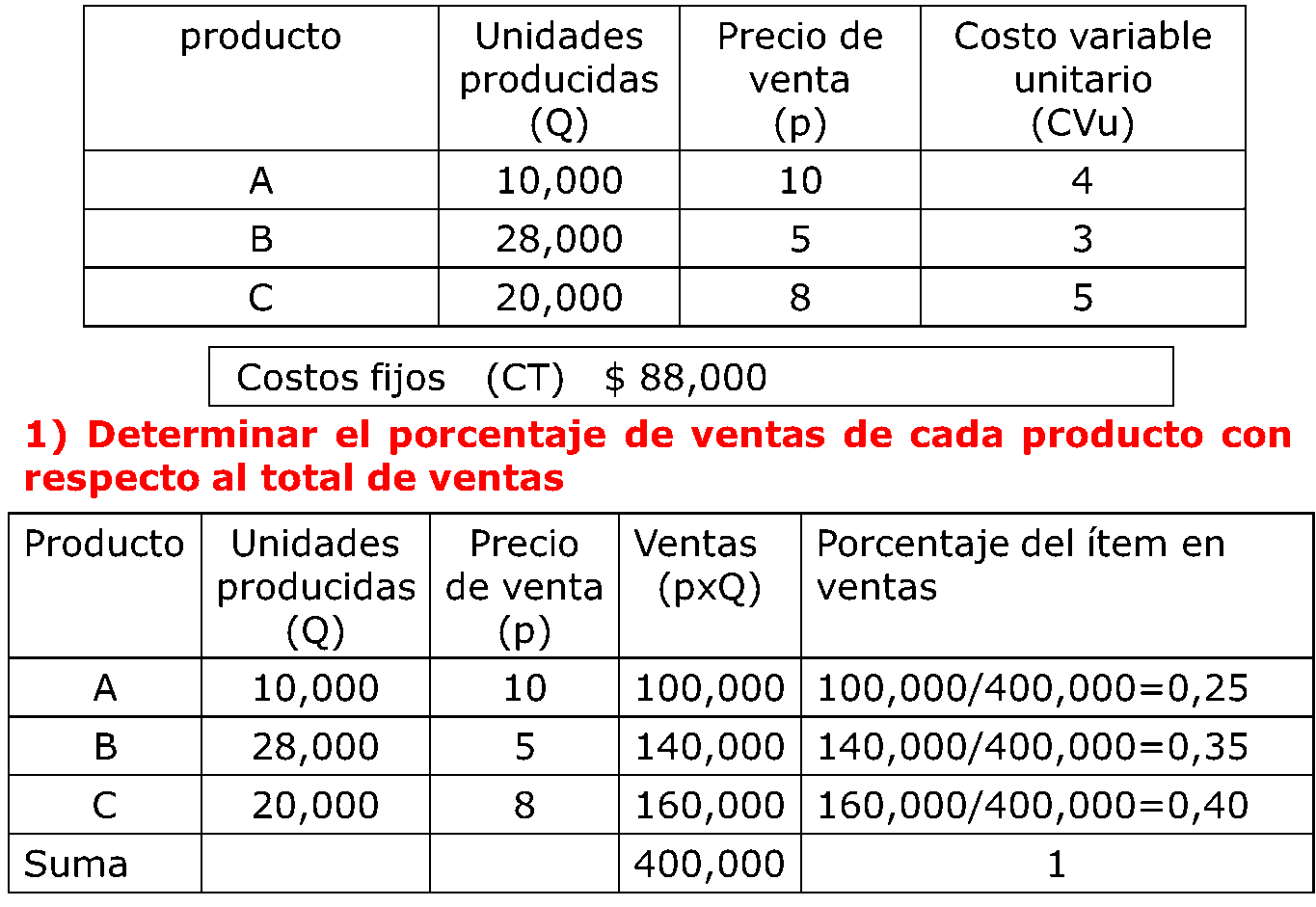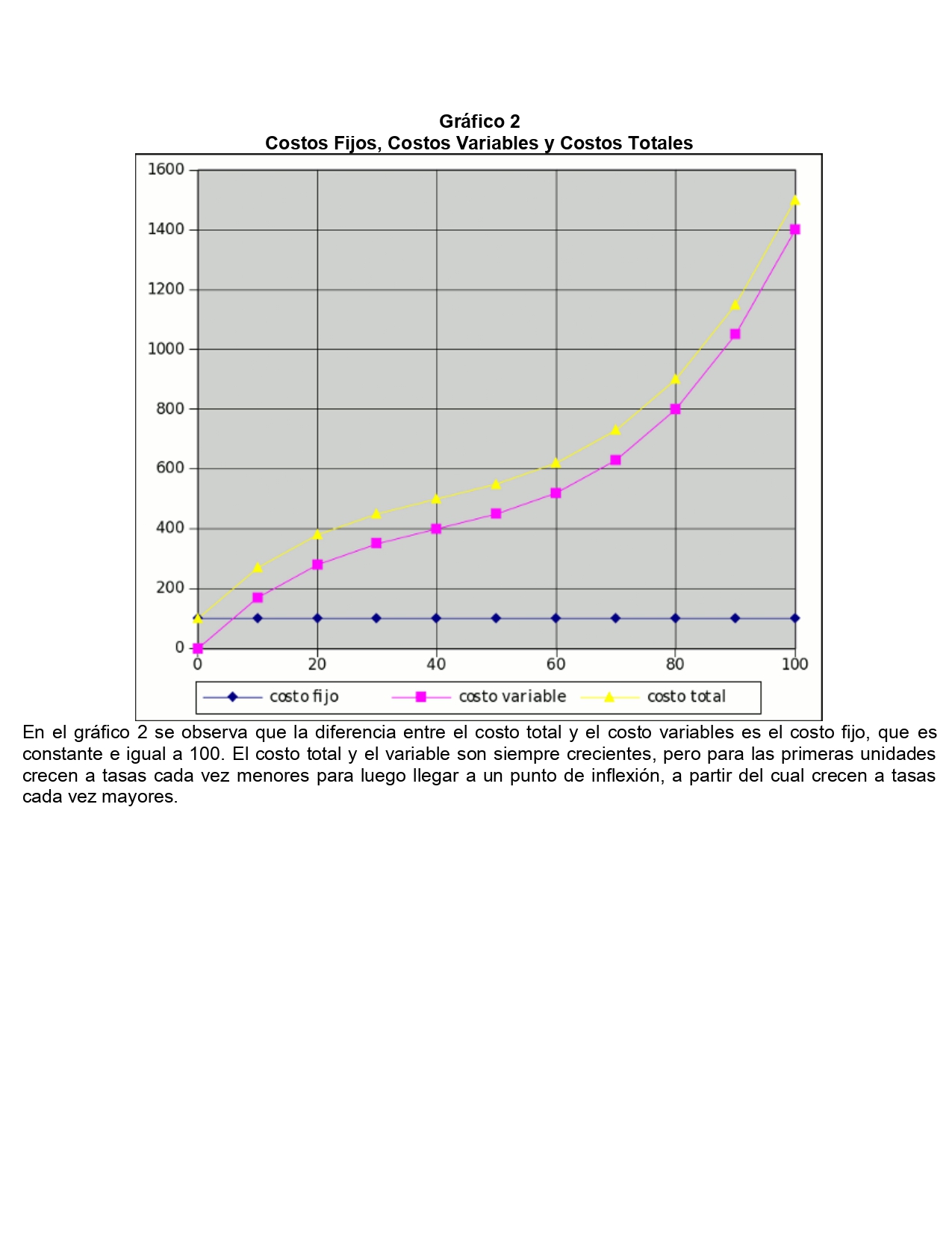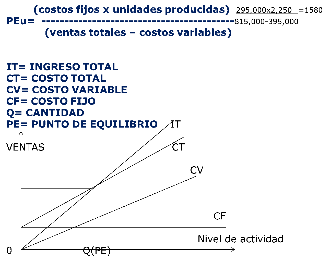 Costo fijo (CF) es la parte del costo total (CT) que la empresa tendrá independientemente de su nivel de actividad. Ej.: alquiler, impuestos, sueldos administrativos.